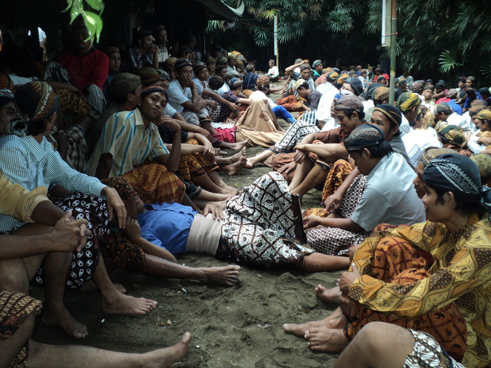"Dalam rangkaian upacara ini semua pria memang memakai blangkon, iket, baju warna hitam dan sarung. Sedangkan wanita memakai kemben yang sebagian berwarna putih," kata Sumitro.